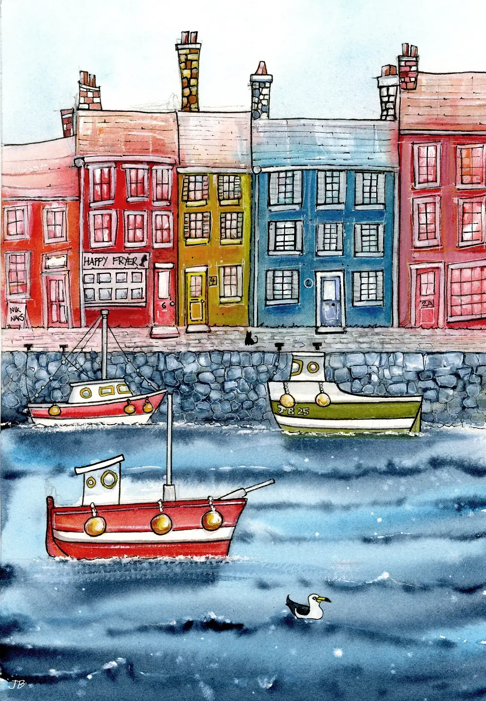 “Colourful Quay” Watercolour Coastal Scene – Art Print