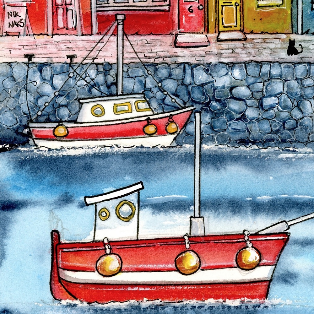 Unframed print of my watercolour “Colourful Quay”. From my five print “Quirky Coastal” collection. Available as a set, see “You may also like below”.