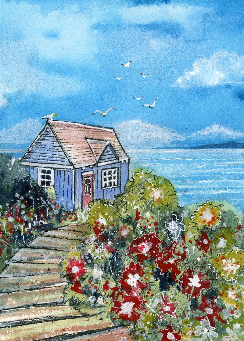 Original watercolour & pen coastal scene by James Blundell, Supplied Mounted & framed.